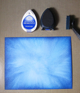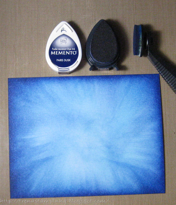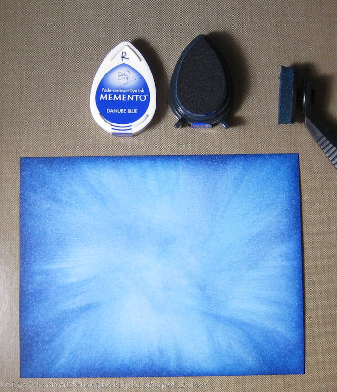I started with the background, layering color. I used a stylus and a light touch to pull color from the edge of Cryogen cardstock in. I started with the lightest blue – I squirted a few drops of ink into the lid, picked up color and pulled from the edge in going all the way to the center. I then added the next darkest blue, picking up color from the ink pad going not as far into the center, and so on – until the final layer of dark blue close to the edge.