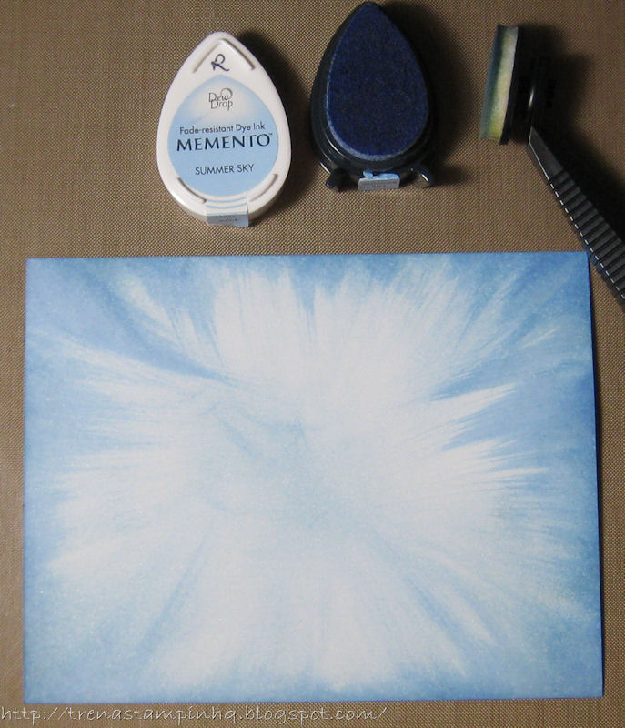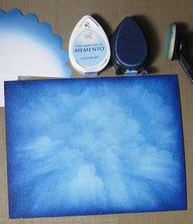 I used a die cut to make a template for the clouds. I picked up the lightest blue with the stylus made small circles over the edge of the template creating subtle clouds.