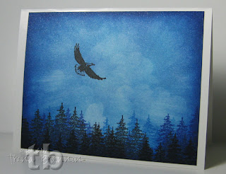 For the forest image, I used a combination of blue and black inks, and stamping off on some of them to make the trees look like they were off in the distance. The eagle is stamped with VersaFine.