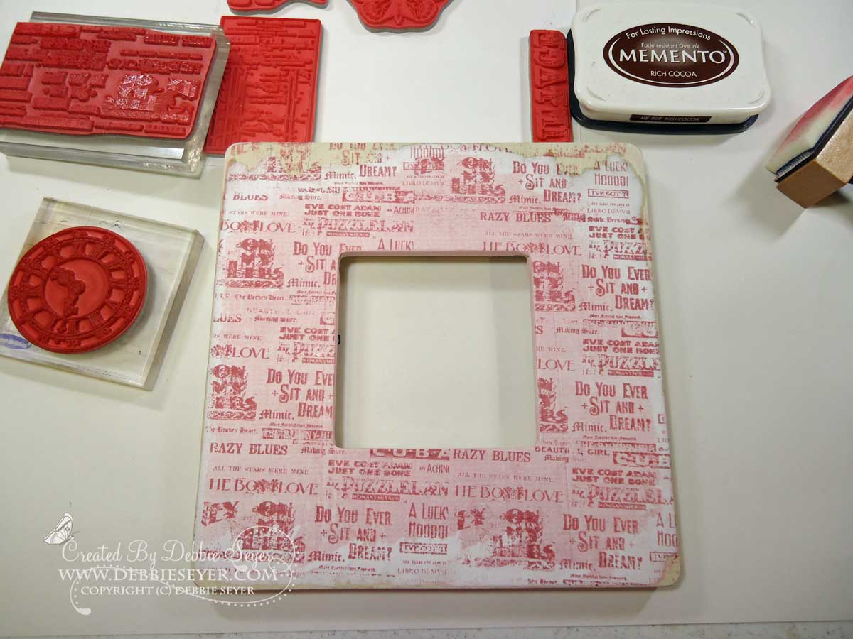 This Altered Frame actually comes with a background….you see, I started a project with it about 3 years ago.  I covered this $1 wooden frame with some pink patterned paper, set it aside to dry and never came back to finish it.  Well I took the perfect picture of my youngest daughter & hubby to go inside the frame a couple of weeks ago and I knew it was time to dust it off and get busy!