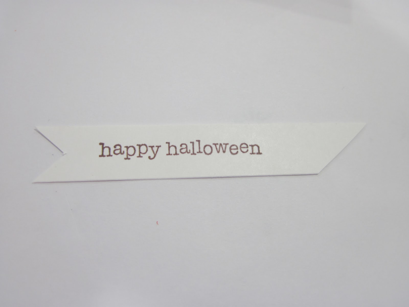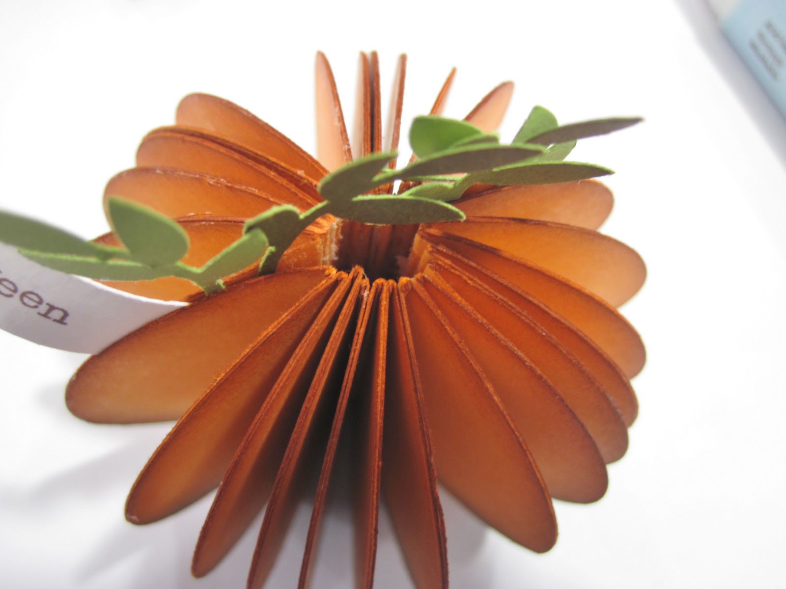 Cut at 1/2″ x 4″ piece of Whisper White cardstock and stamp a greeting. (Here I used Teeny Tiny Wishes in Chocoalte Chip Ink). You could also print out people’s names onto Whisper White cardstock and cut out the strips to make place cards. One end is cut all the way across at an angle. This is the end that will be adhered inside your pumpkin. The other end is cut into a dove-tail.