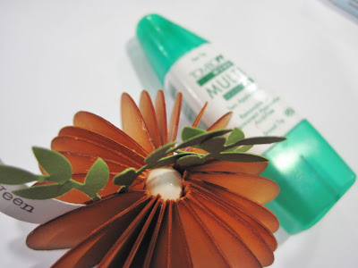 (Optional: You can take a needle and a little re-inker to color in the glue on top. Then it will dry to a translucent color. For the apple I used Lucky Limeade to add color to the glue. For the pumpkin I used Peach Parfait. You could use Pumpkin Pie, I just don’t have the re-inker in that color.)