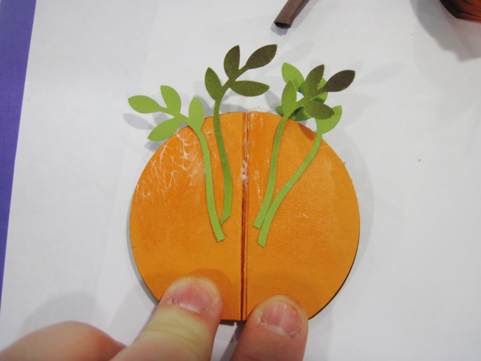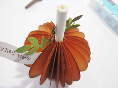 Then insert the rolled paper dowel into the center of the pumpkin.