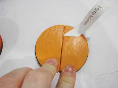 Adhere your label to the other pumpkin half. (Yes, I know this one is upside-down. I just didn’t realize it until later. It’s stamped right-side-up on the other side.)