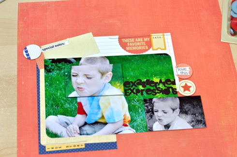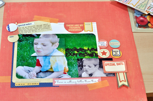 I started this layout with a photo that I was working on, and this beautiful red/orange paper for my background. I knew I wanted to use a LOT of tags on my page, so for now that’s all I pulled out.