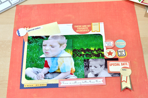 Things were beginning to come together here, so I added a couple more of the tiny tidbits on the right, then layered up a date tag with some cute banner pieces layered up on top to provide dimension.