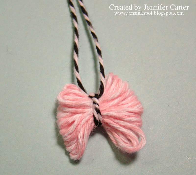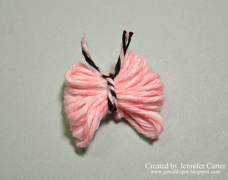 I had so much fun putting this together! Don’t you just love those twine butterflies!? You can create so many fun color combinations and even have multi-colored butterflies like you see on the card! You can make the butterflies very large and full or very small and delicate. I’ve included a tutorial at the bottom of this post to show you how to create your own.