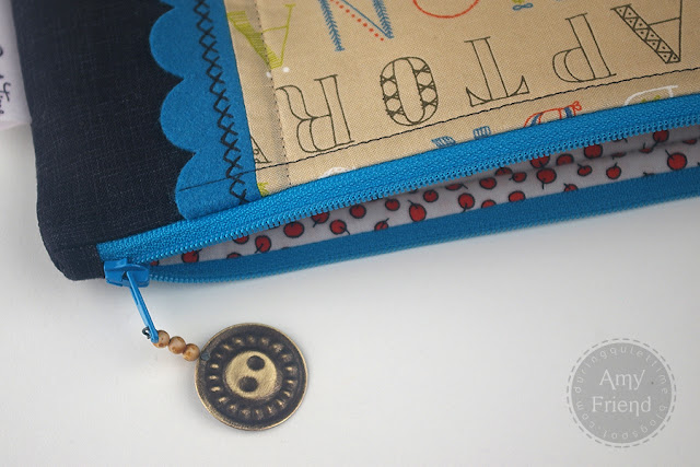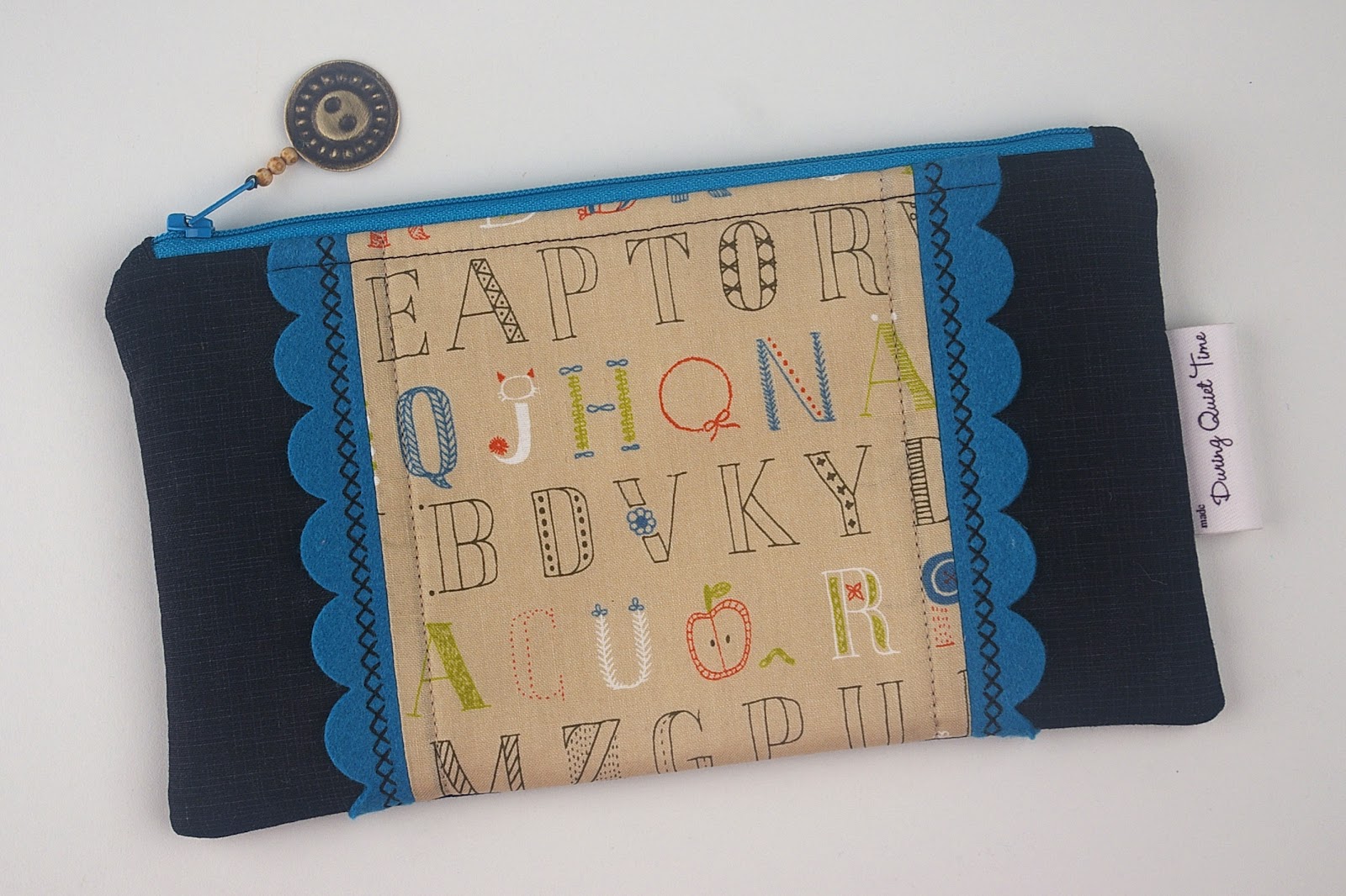 I then sewed the felt strip into the seams of my pieced pouch front and embellished with a cross stitch on my machine. I think it adds a really professional looking touch to the pouch.