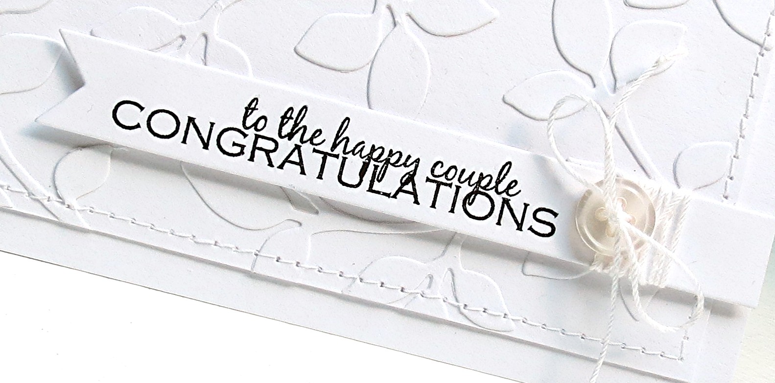 I then die cut the banner from white cardstock; stamped it, in Basic Black ink, with the “CONGRATULATIONS to the happy couple” sentiment; and wrapped its right end with a length of white string, which I tied, in a bow, after lacing it through a white button. It was then adhered, with foam tape, flush with the right side of the card face, to complete the look.