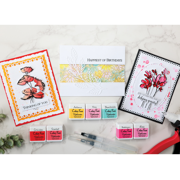 What products will be highlighted: Color Fuse Inks, waterbrush, blending brushes, Glue Press, Misti Stamping Platform, and die cutting using the Mini Maker Die Cutting Machine.