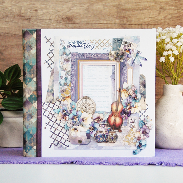 What techniques will I learn or use: You will learn about layering with various elements, working with delicate laser-cut embellishments, and scrapbook layout design.