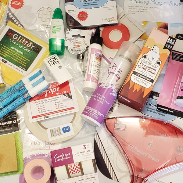 "What adhesive should I use?" We will answer that common question in this relaxing and informative lecture-style class. You'll receive a glue-y goodie box featuring a nice array of items, as well as an information sheet highlighting all the products presented as a great reference. We will talk about various tape runners, liquids, and other adhesive options including how to remove or "suspend" adhesive if you need to redo your project! In addition to your take-home class product pack, lots of additional adhesive goodies will be given as bonus prizes at the end of class. (Please Note: The photo is sample of products presented, not the take-home goody bag.)