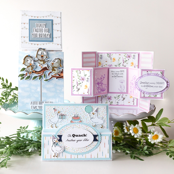 What techniques will I learn or use: You will learn about interactive card construction including how to assemble a gatefold accordion card, a pop-out box card, and a pocket slider card using pre-cut, pre-scored bases.
