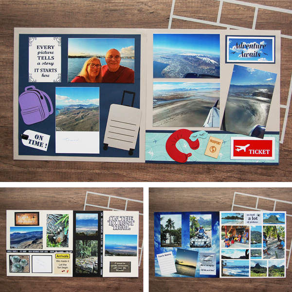 Join us for a fun class creating a 6-page scrapbook layout. You will be using our new Travel Adventure paper with some new great laser cuts designed specifically for this class. A special feature of this class is a reuseable plastic template which you can use in different ways to arrange a number of photos on your pages. And your class ticket will entitle you to 10% off all purchases in our booth both Friday and Saturday.